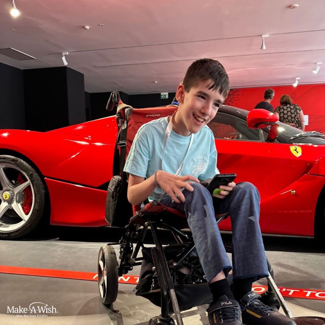 Το ταξίδι του Χρήστου, μαζί με του γονείς του, ξεκίνησε με τις καλύτερες προδιαγραφές αφού είχε τη δυνατότητα να ταξιδέψει παρέα με τους κυβερνήτες του αεροπλάνου, μέσα στο πιλοτήριο. Φτάνοντας στην Μπολόνια και συγκεκριμένα στο Maranello, μαζί με την οικογένειά του, οδηγήθηκαν προς το φαντασμαγορικό μουσείο της Ferrari. Περνώντας την είσοδο, ένιωσαν ξαφνικά πως  μεταφέρθηκαν σε έναν άλλο κόσμο. Ο Χρήστος ξετρελάθηκε με τα μοναδικά αυτοκίνητα που στόλιζαν τον χώρο, ενώ παρατηρούσε την κάθε λεπτομέρεια και τις κινήσεις των εργαζόμενων, που συναρμολογούσαν με μεράκι και απόλυτη ακρίβεια τα μοντέλα. Η ξενάγηση συνεχίστηκε στο τμήμα του σχεδιασμού, εκεί όπου ο Χρήστος είδε από κοντά τα πρωτότυπα μελλοντικά αυτοκίνητα, ενώ έμεινε έκπληκτος με τις λεπτομέρειες και την καινοτομία που χρησιμοποιούν. Η επίσκεψη ολοκληρώθηκε με μια βόλτα στο μουσείο της Ferrari: μια συναρπαστική εμπειρία ζωής. Ξετρελάθηκε με τα εκθέματα, ενώ είχε και την ευκαιρία να “γνωρίσει” από κοντά όλα τα συλλεκτικά αυτοκίνητα και τις ιστορίες αυτών. Οι δύο εθελόντριες που τους συνόδεψαν από το Make-A-Wish της Ιταλίας, ήταν εξαιρετικές, και ο Χρήστος τις λάτρεψε. Η μία, μάλιστα, μιλούσε κι Ελληνικά και μπόρεσε να τον βοηθήσει ουσιαστικά. Στο εσωτερικό του μουσείου υπάρχουν εκθέματα όπως το γραφείο του Enzo Ferrari και διάφορα μοντέλα της εταιρίας, από τα πιο κλασικά έως τα πιο σύγχρονα.